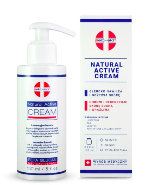 Beta-skin Natural Active Cream to wyrób medyczny stworzony z myślą o pacjentach z takimi objawami chorób skóry jak: łuszczyca, atopowe zapalenie skóry,, łojotokowe zapalenie skóry, kontaktowe zapalenie skóry i egzemy. Krem łagodzi podrażnienia, zaczerwienienia i szybko oraz skutecznie koi skórę. Ponadto niweluje świąd i pieczenie towarzyszące dermatozom.